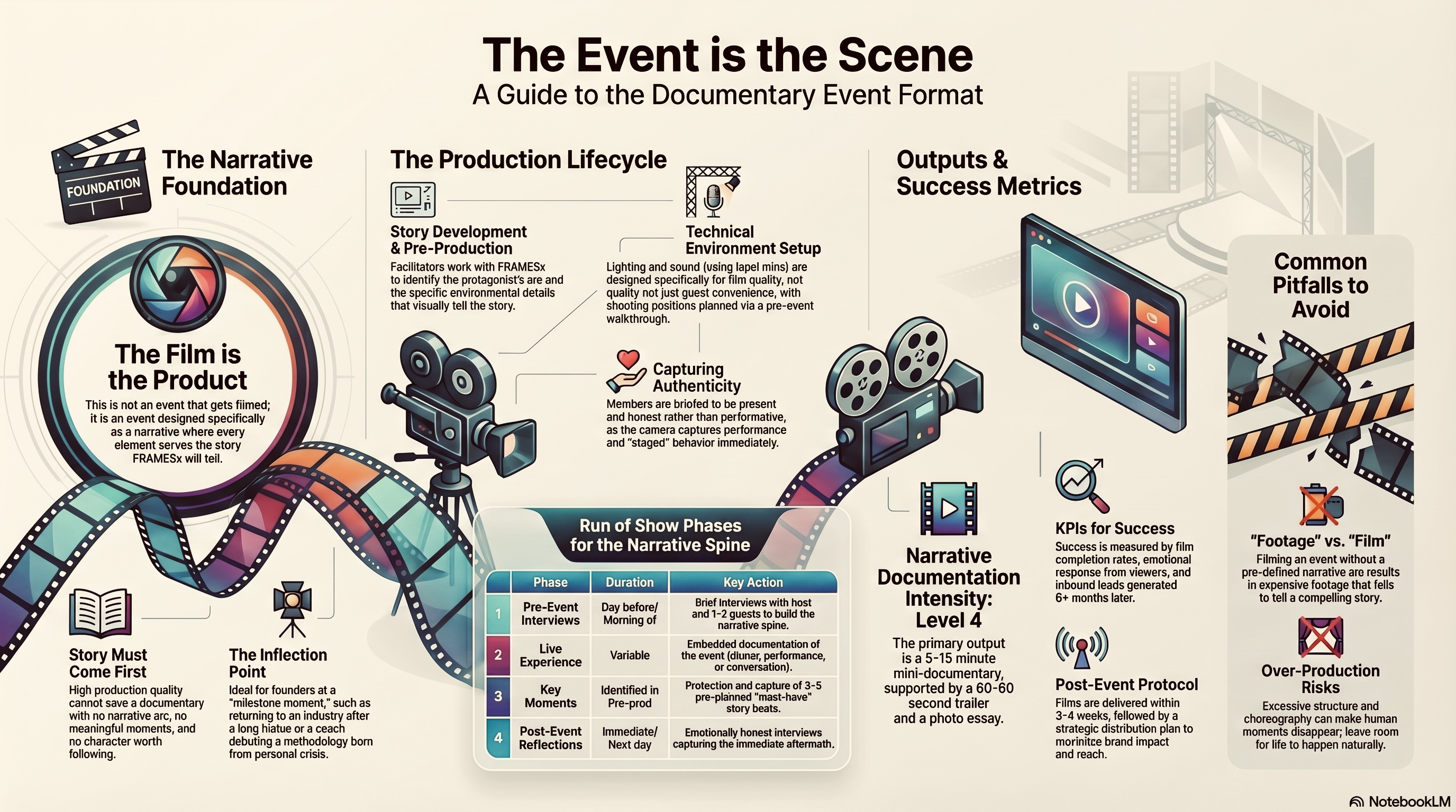 The Documentary Event is the most ambitious format in the ecosystem. It is not an event that gets filmed. It is an event designed specifically as a narrative — where every element serves the story that FRAMESx will tell afterward. The product is not the experience. The product is the film.